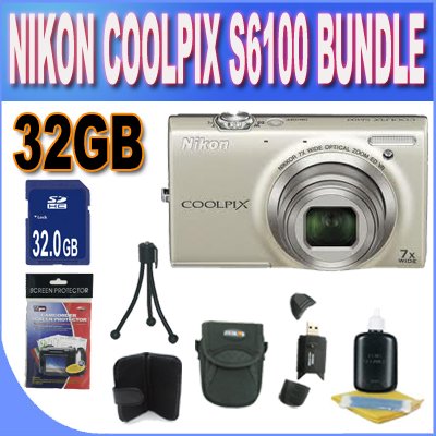COOLPIX S6100 16 MP Digital Camera with 7x NIKKOR Wide-Angle Optical Zoom Lens and 3-Inch Touch-Panel LCD (Silver) + 32GB SDHC Memory + SDHC Memory Card Wallet + Shock Proof Case w/Strap + USB Card Reader + Mini Tripod + Accessory Saver Bundle!! Special Offer