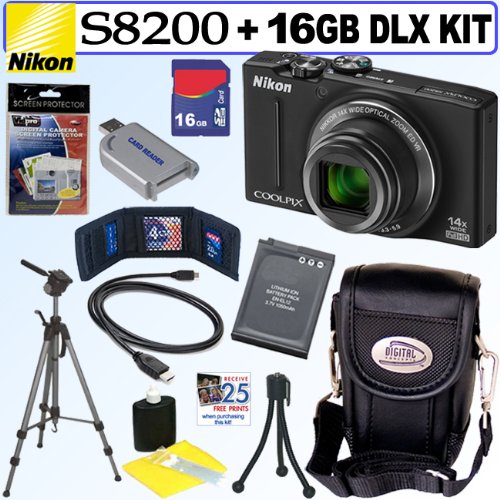 Nikon Coolpix S8200 16.1 MP CMOS Digital Camera (Black) + EN-EL12 Battery + 16GB Deluxe Accessory Kit Special Offer